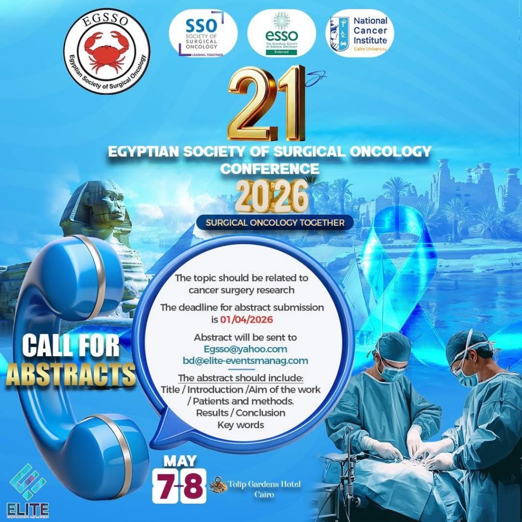 Call for Abstracts | EGSSO 2026 The Egyptian Society of Surgical Oncology (EGSSO) invites researchers, surgeons, and oncology professionals to submit abstracts for the 21st EGSSO Conference 2026 under the theme: Surgical Oncology Together Conference Details • Dates: May 7–8, 2026 • Venue: Tolip Gardens Hotel, Cairo Abstract Topic Submitted abstracts should be related to […]